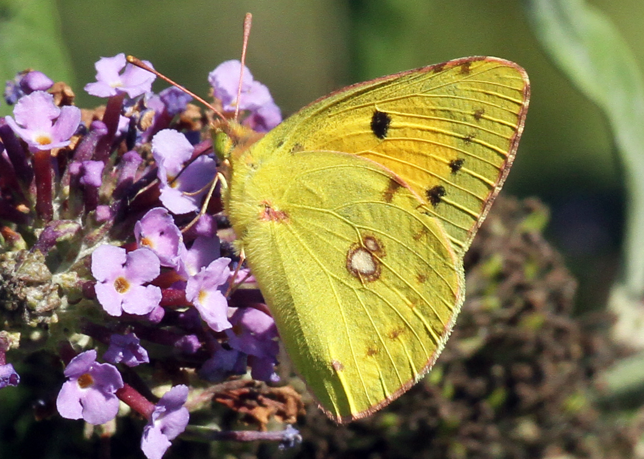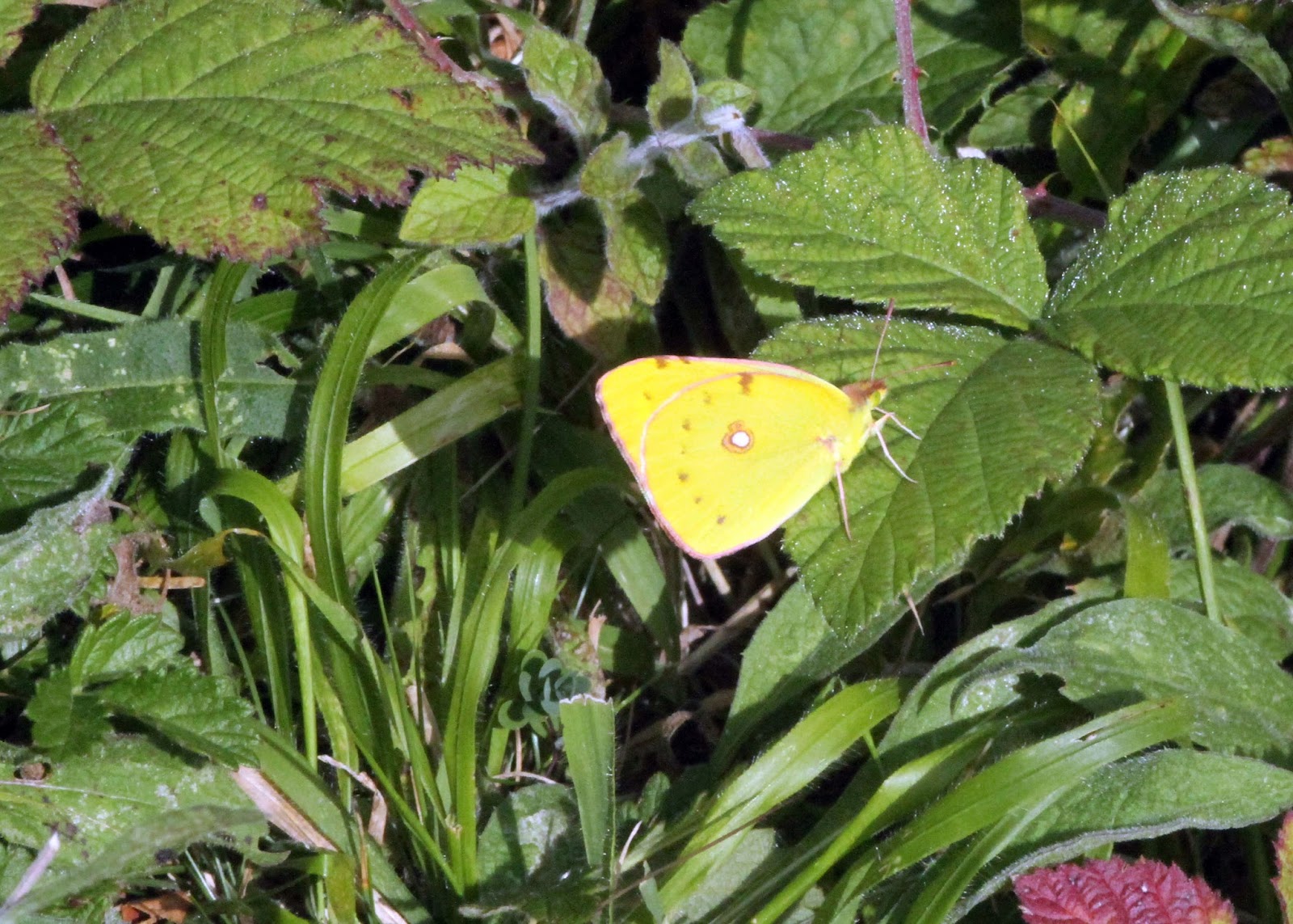 Clouded Yellows rarely settle with their upper wings visible. Therefore I have no good photos of the upper sides of the wings, but these are more brightly orange-yellow, completely black-edged in the males, and black-edged but broken up with orange-yellow splashes in the females. Here is a distant shot of a male, blurred, in flight.