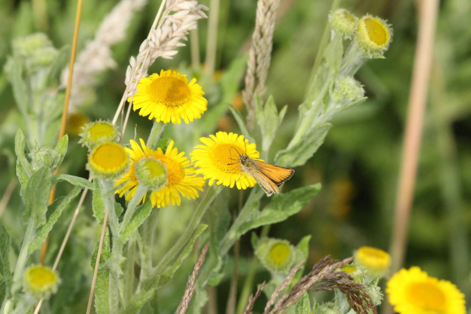 The Essex Skipper is a fascinating, if tiny and fairly plain, butterfly to identify precisely, and it is very difficult trying to distinguish it from the very similar Small Skipper as it buzzes from point to point around rough clumpy grass.