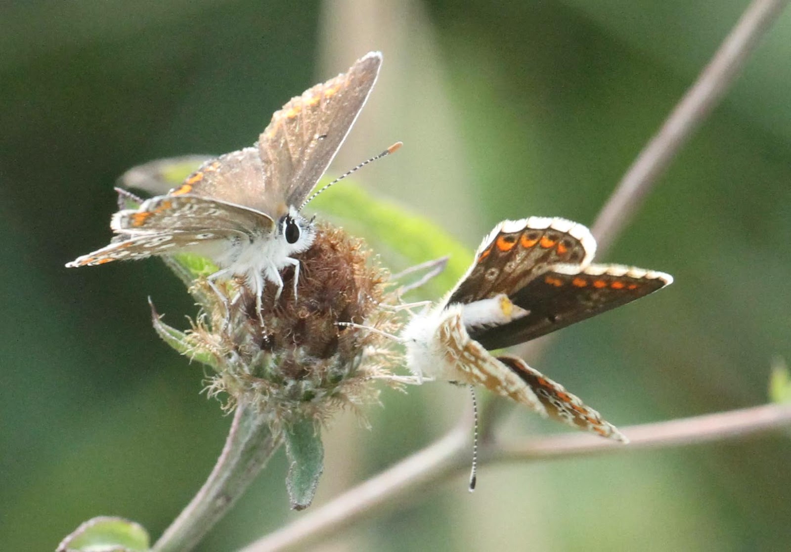 The first impression of a Brown Argus is usually of a chocolate brown small butterfly, that looks quite a bit like a female Common Blue in some ways, and it moves and has a definite jizz of a Blue Butterfly. I would say it is usually a clearer and perhaps richer brown in contrast to the female Common Blue, with a clear black mark in the centre of the upper fore-wing.