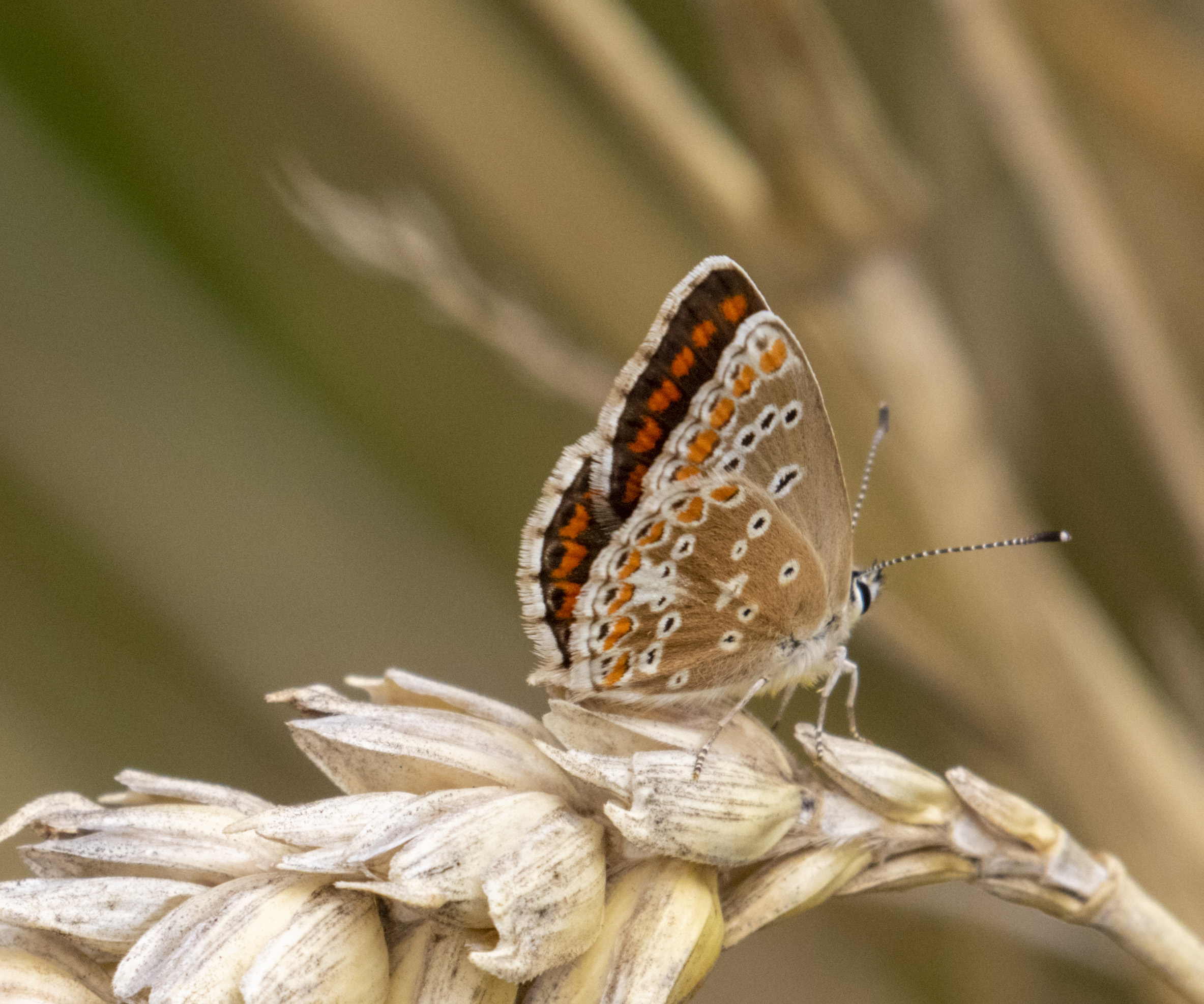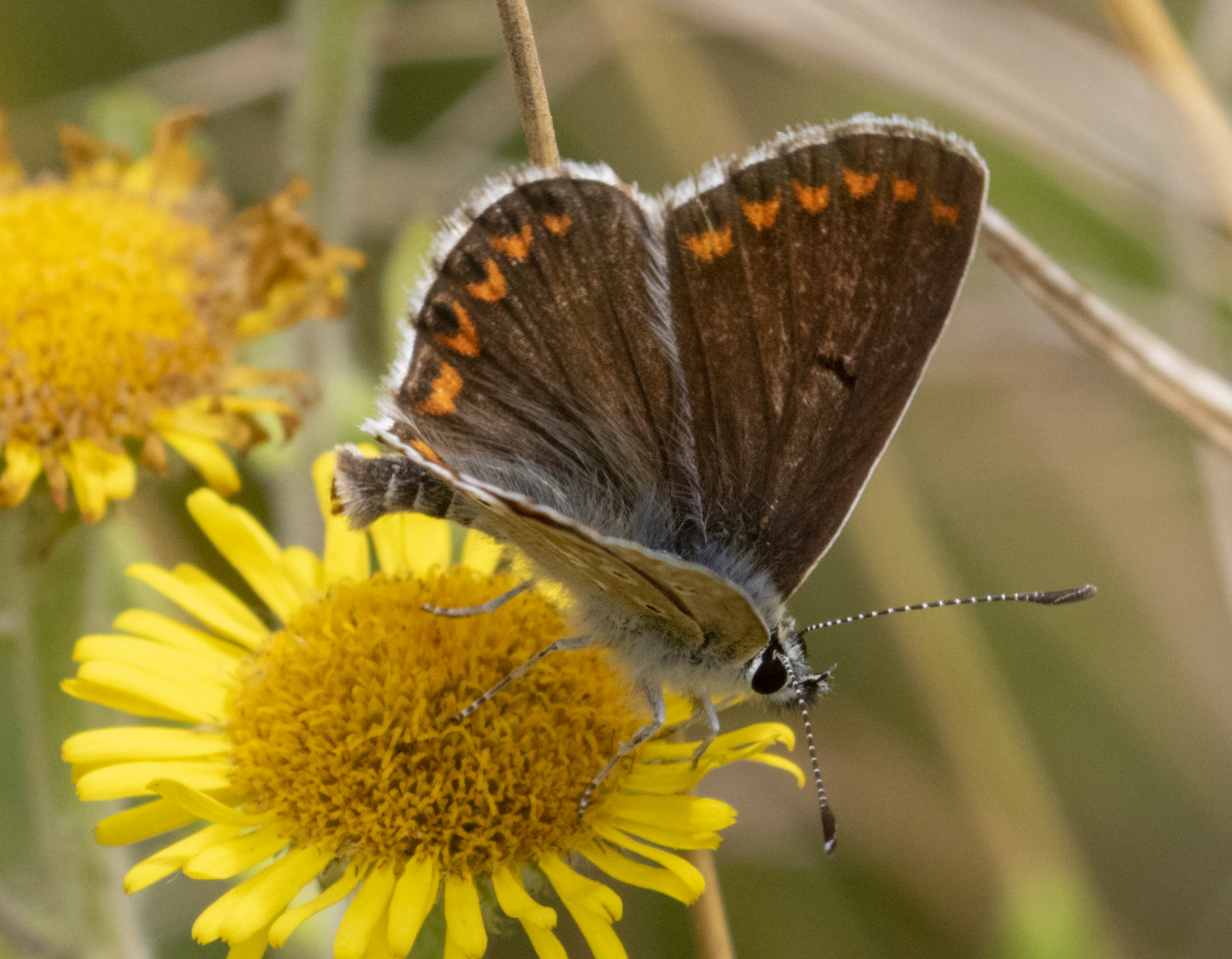 This Brown Argus should be a male, judging by the slight fading out of the orange spots on the top of the forewing as they approach the front margin of the wing, and the projecting abdomen. It will also be a second generation adult, as it was seen in August.
