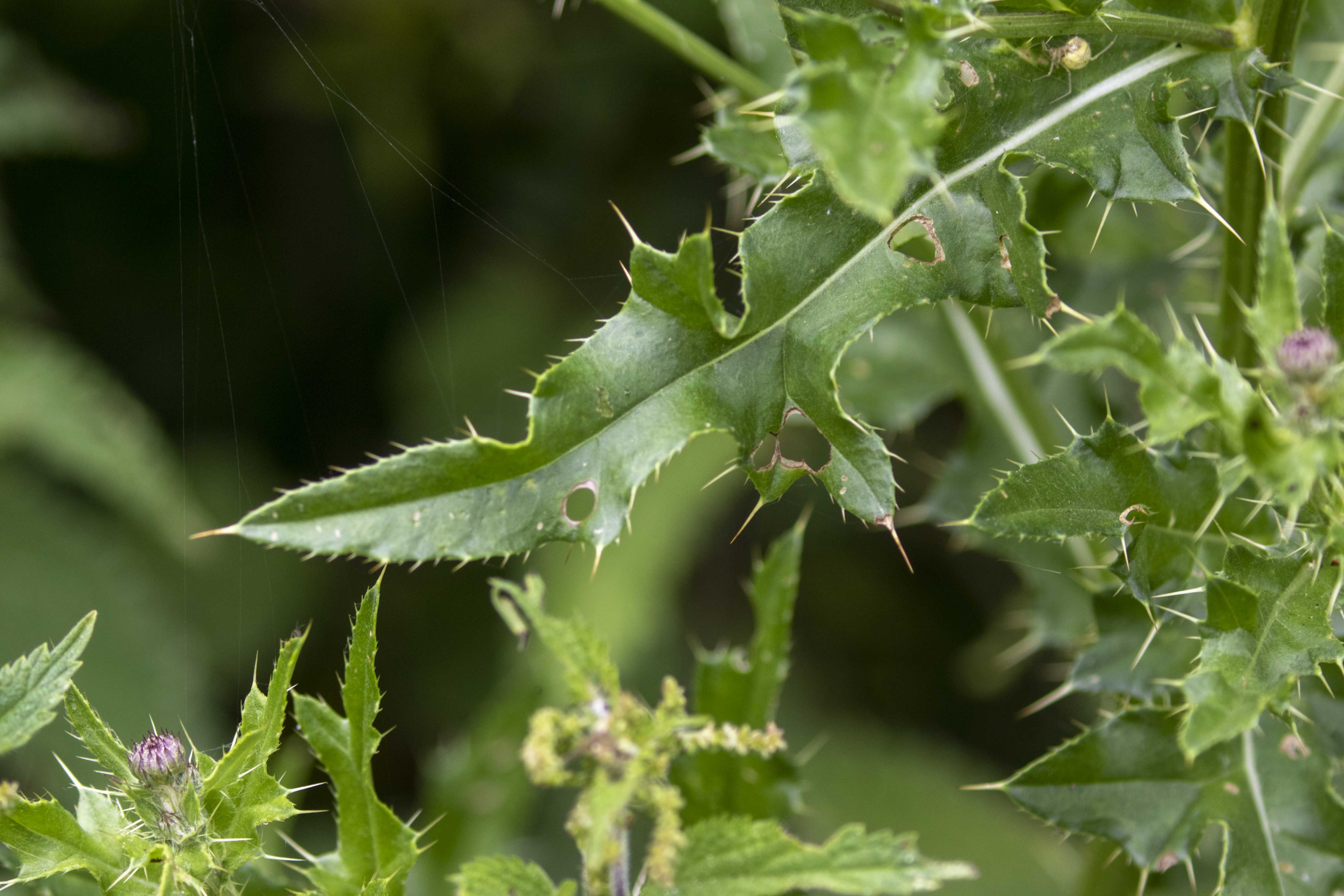 The main larval food-plant species in the UK are thistles. These holes were on thistle leaves found beside the Bourne, and might have been caused by Painted Lady caterpillars.