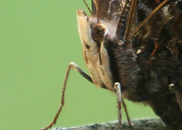 Like the other Nymphalids, the Peacock, Painted Lady, Small Tortoiseshell and the Comma, the Red Admiral has only four functional legs, the front pair of the six being modified into smaller hair-covered “brush feet”. Here is a close-up of the creamy white pair of brush feet of a Red Admiral. They may be involved in sensory perception: