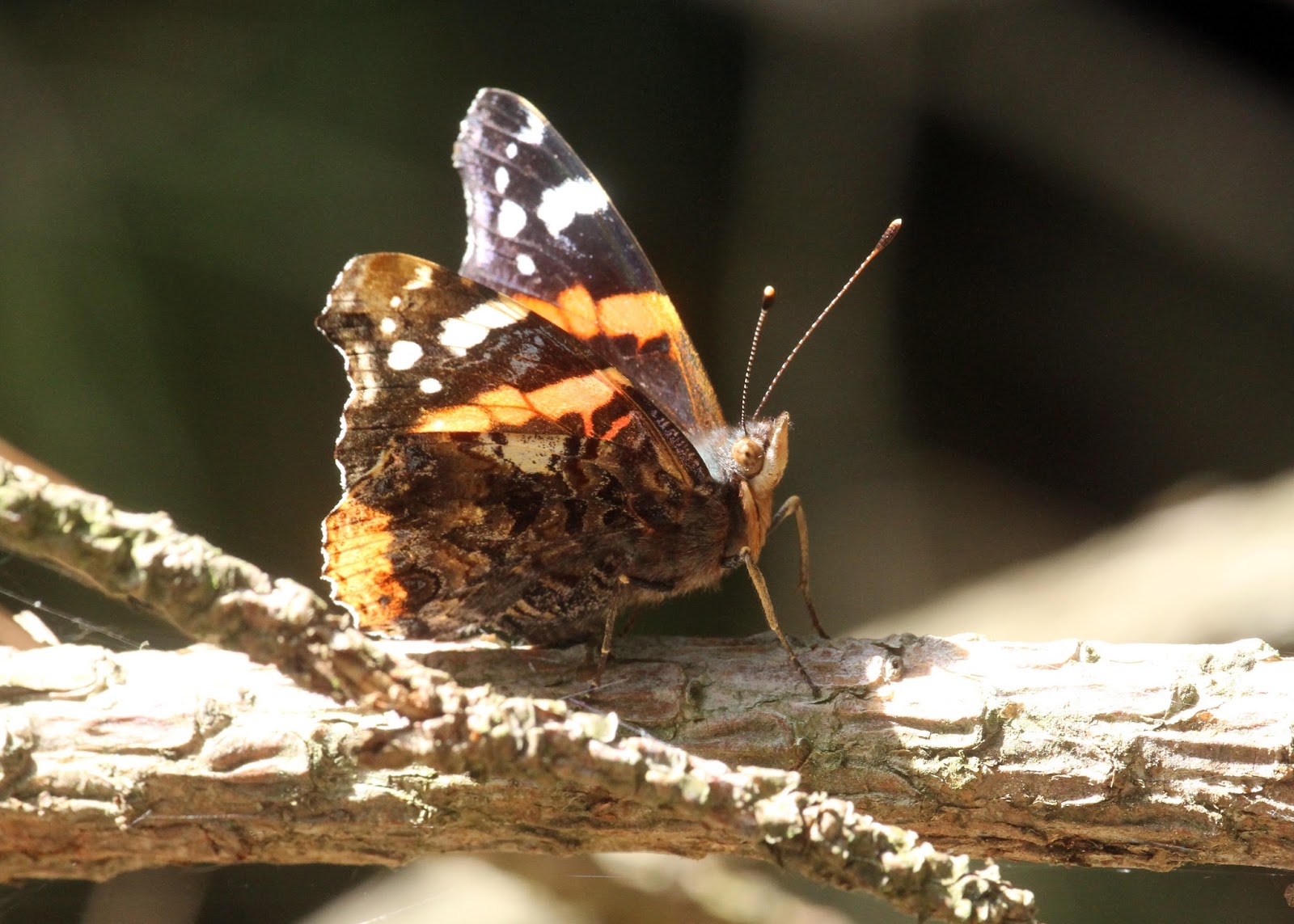 On the underside, the situation is even more interesting, as the fore wing is brightly coloured with the orange and white flashes, but the rear wing is very well camouflaged, allowing the butterfly now to slip its fore-wings inside its rear wings and hide, particularly, it is alleged, in order to overwinter in sheltered spots. This would be a new pattern of behaviour for the Red Admiral in this country, which used to be said to be an entirely migratory butterfly here, thought never to over-winter in the UK.