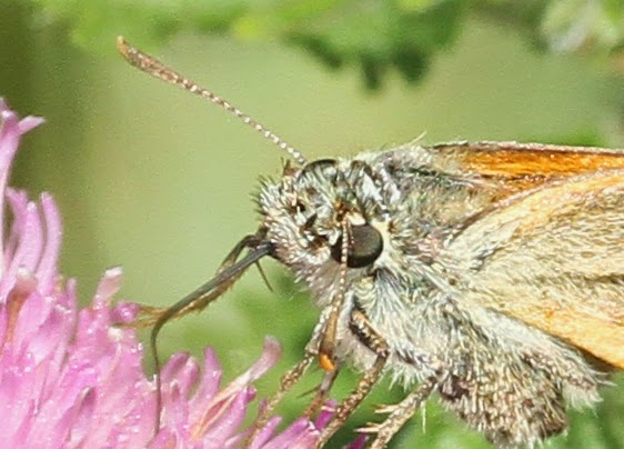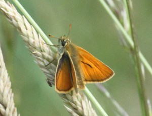 The forewing of both the Small and Essex Skippers has a narrow but clear brown line on the rear margin. The way to separate the Small Skipper from the Essex Skipper is to examine the underside of the antennae tips – they are orange in the Small Skipper but a clear black in the Essex Skipper. The butterfly below is therefore a Small Skipper!