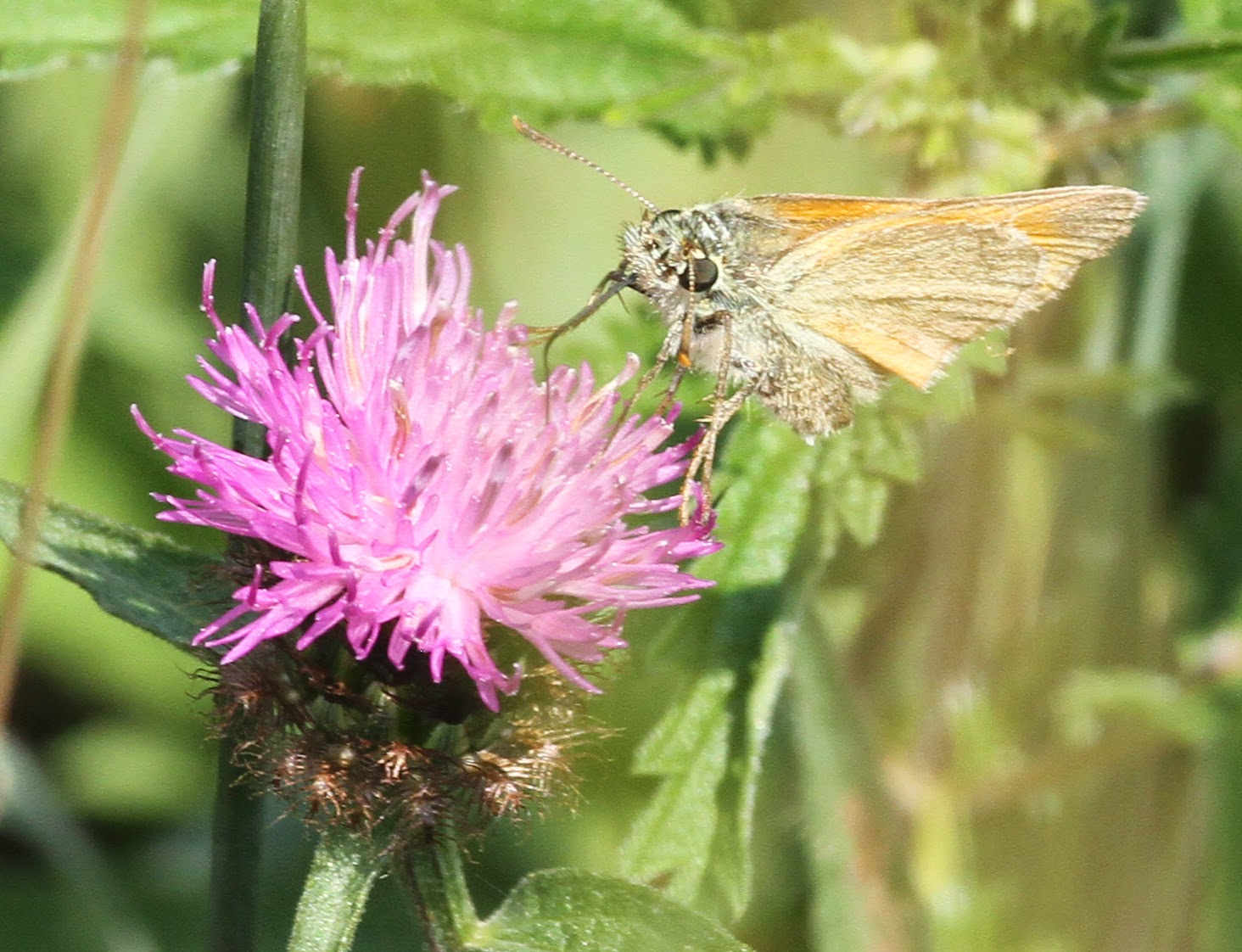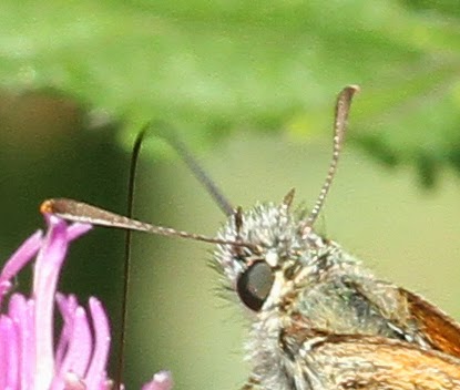 Most of the time however all you can see with naked eye is the golden flicker of wings through the long grass, or a small triangular golden shape feeding off a knapweed or other flower!