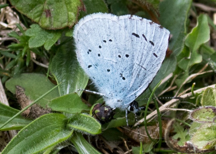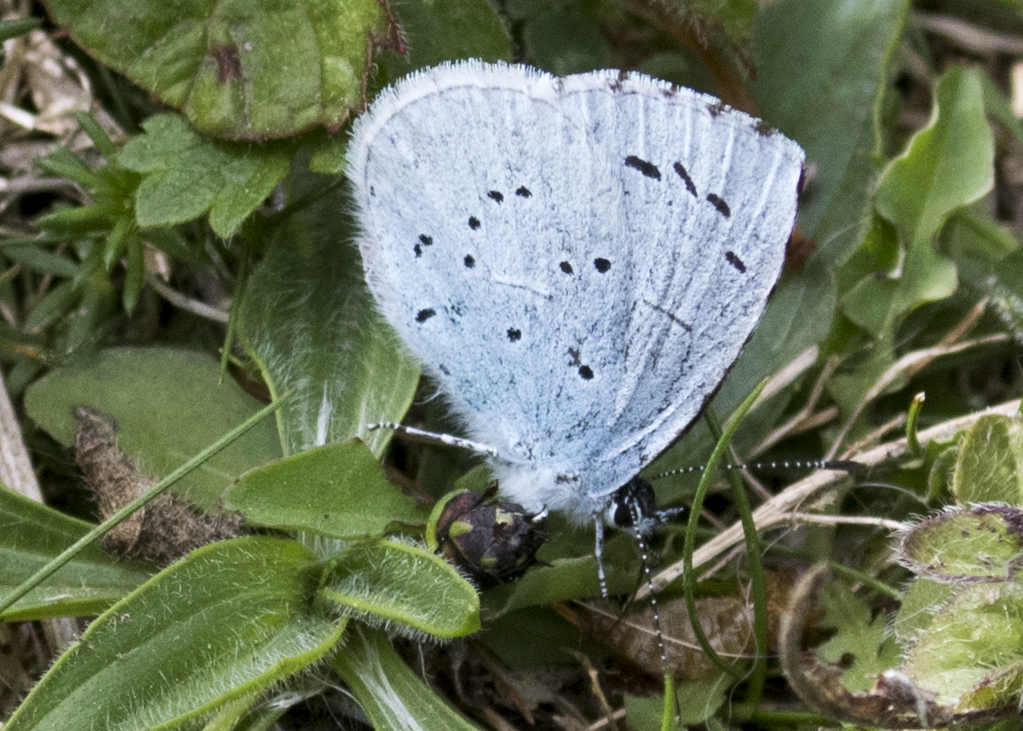 The Holly Blue does come down to ground level from time to time, as seen in this photo from Queensdown Warren (16.05.2017) where this particular butterfly is exploring the chalk downland vegetation. This butterfly is well-marked, and is showing the pattern of spots on the underside of both wings very well. The chequering on the edge of the fore-wings is just visible.